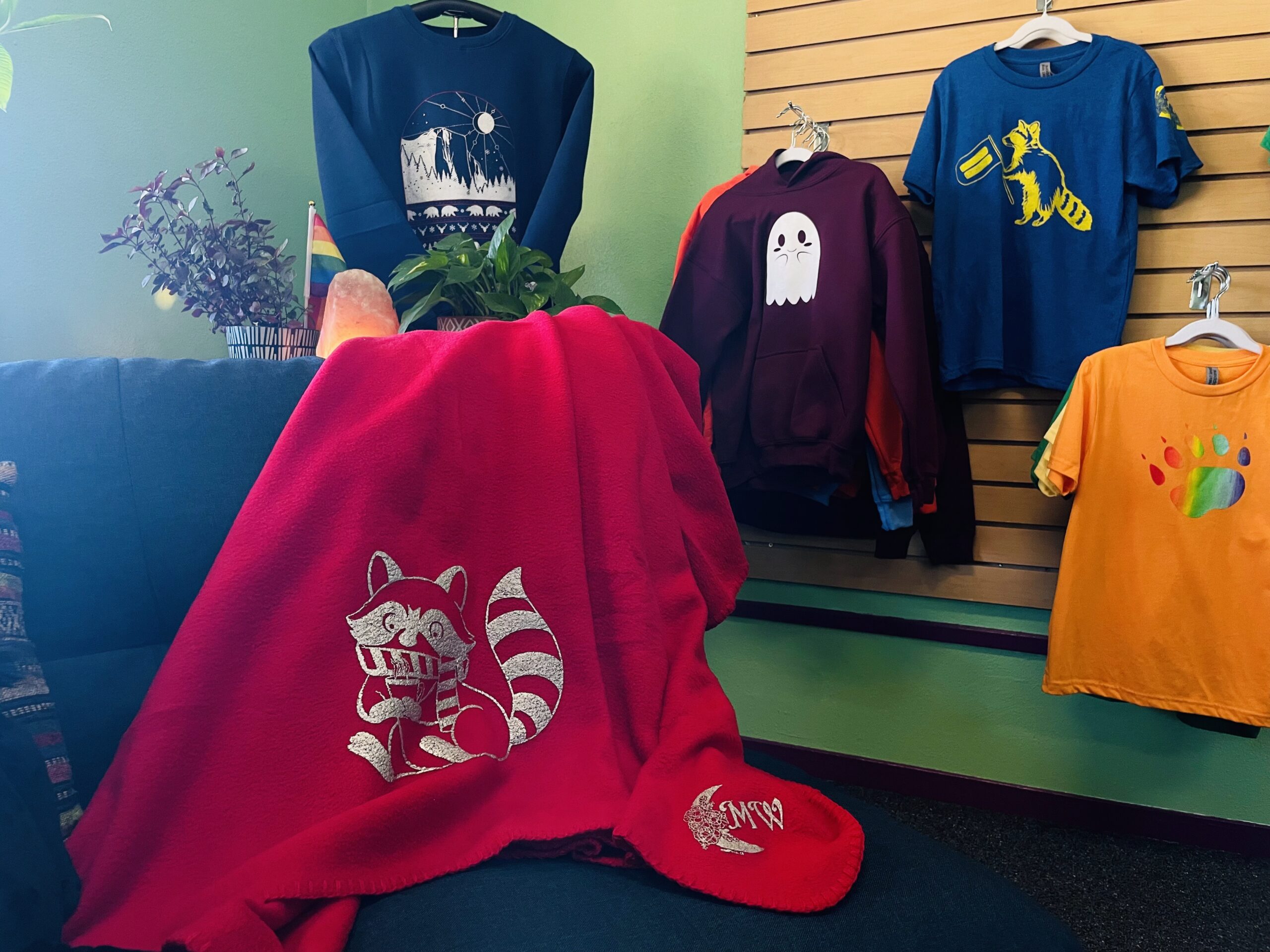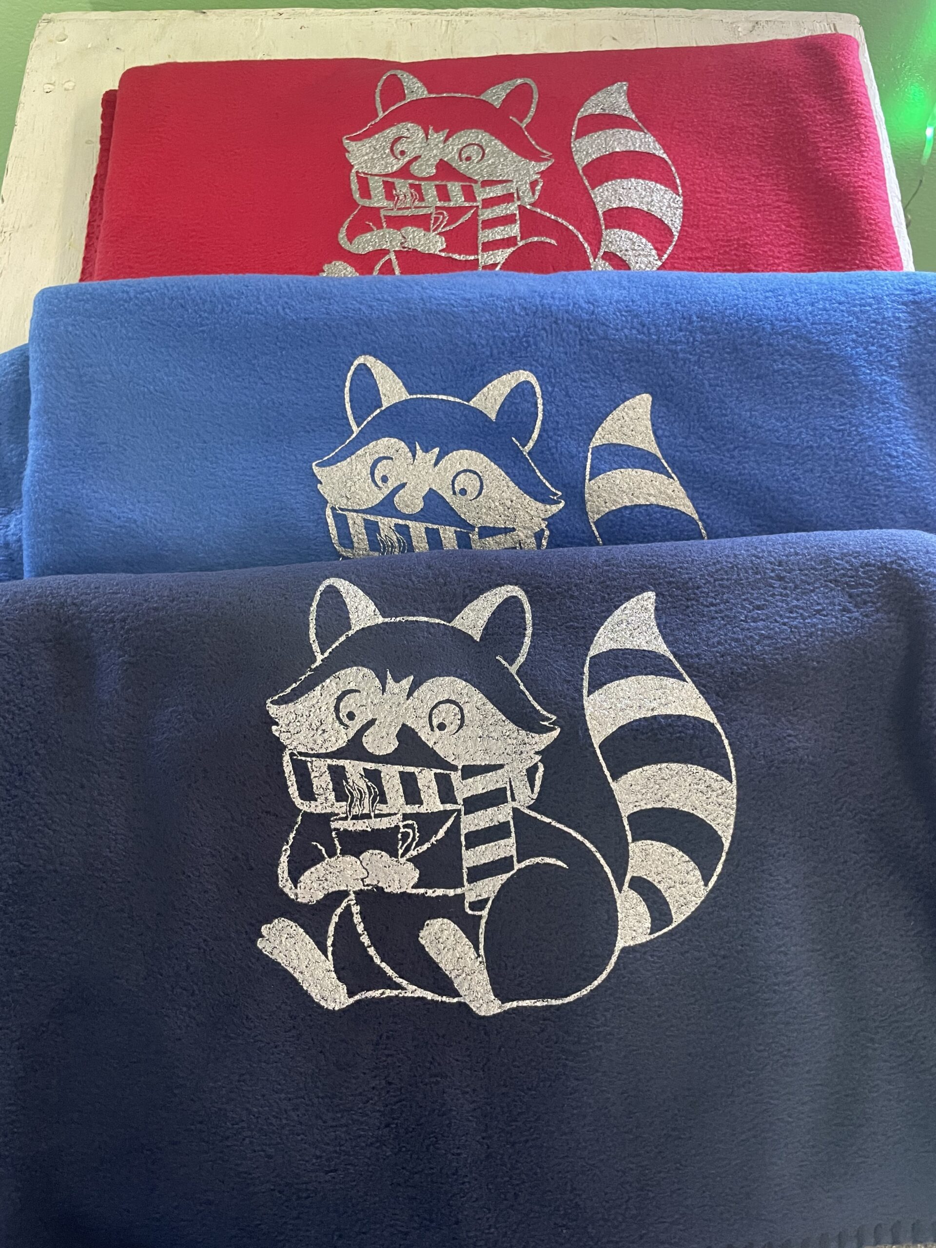 Our Cozy winter racoon design – on a cozy blanket!  This blanket is 50″x60″ (About 4ft x 5ft) and is made of 100% polar fleece. The racoon is printed in a soft silver ink that leaves the blanket feeling soft and flexible.