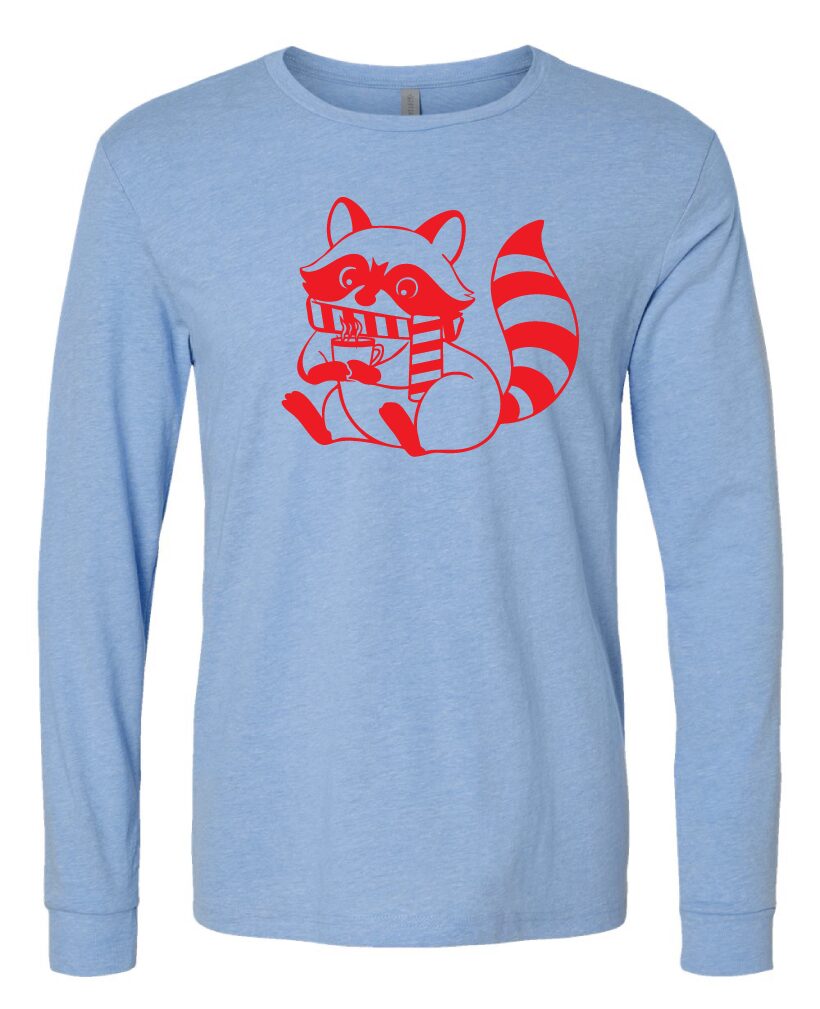 Instagram poll runner-up design: A cozy winter raccoon on a long sleeve shirt. Stay cute, cuddly, and comfortable this winter season follower chosen design!