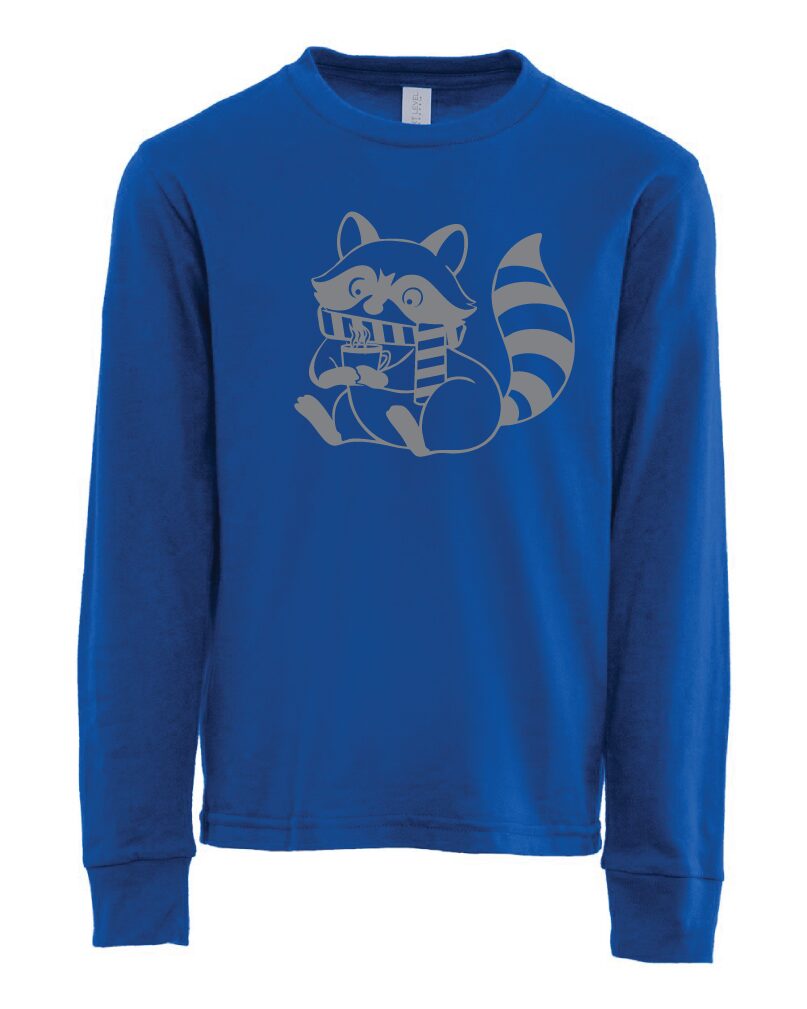 Instagram poll runner-up design: A cozy winter raccoon on a youth sized long sleeve shirt.